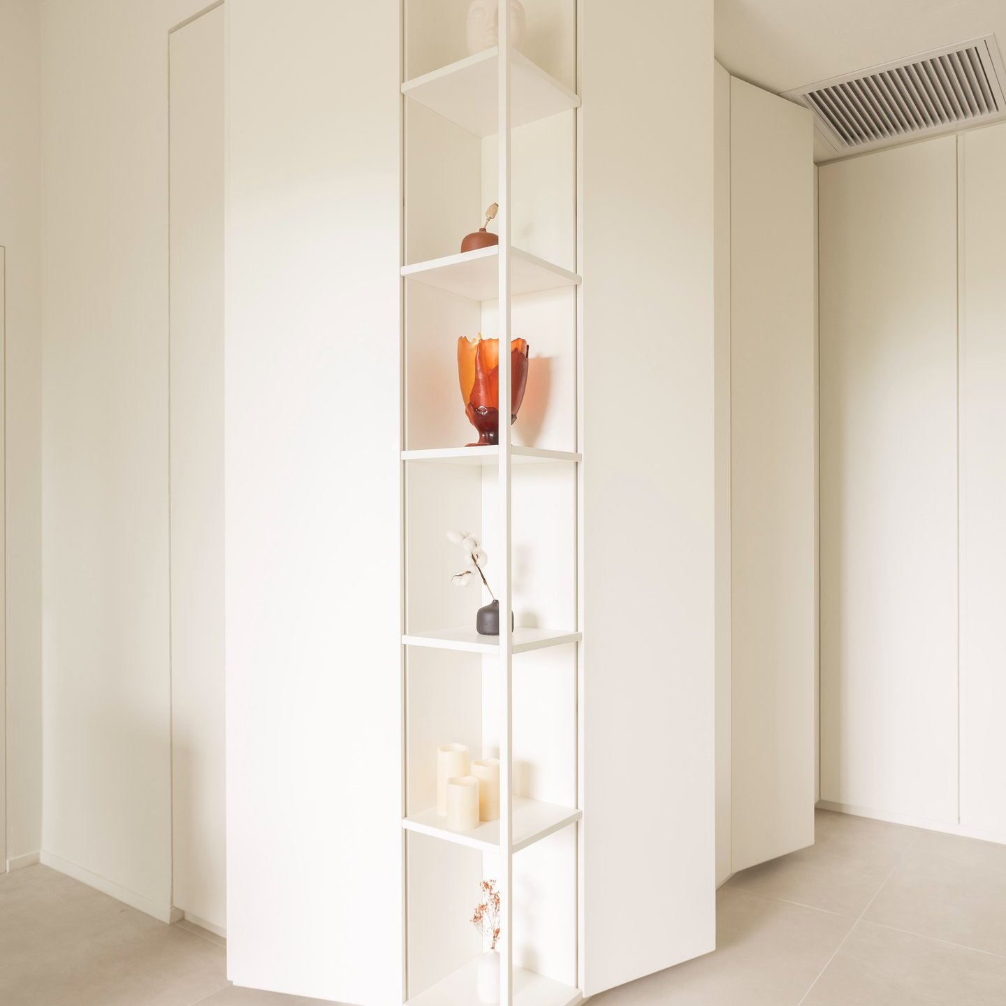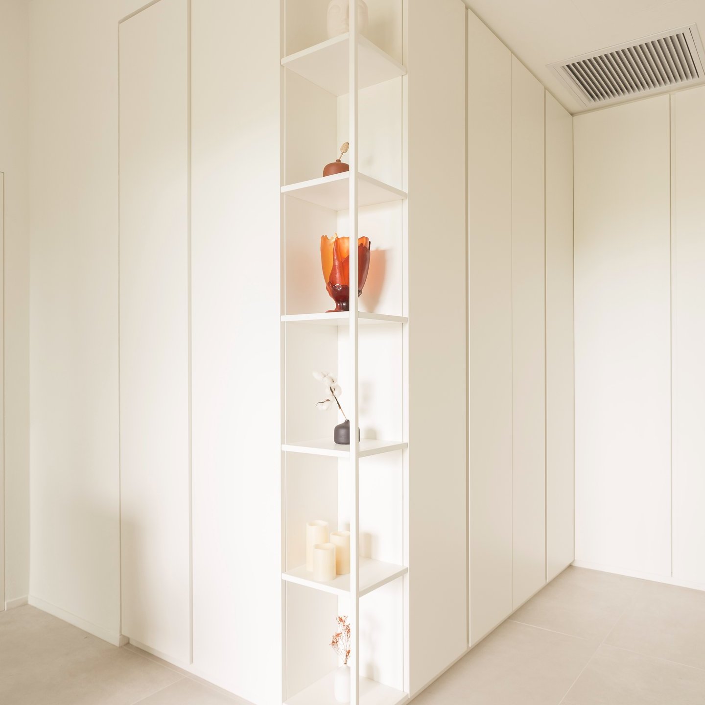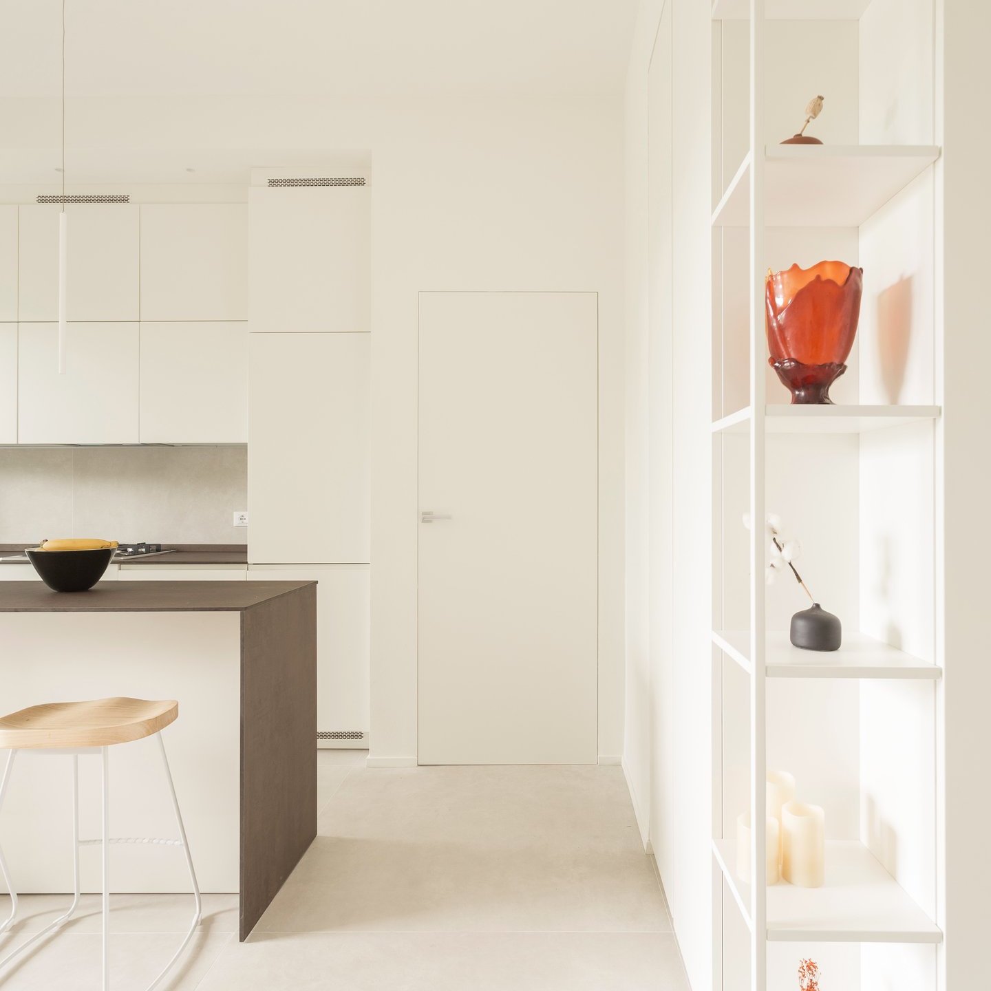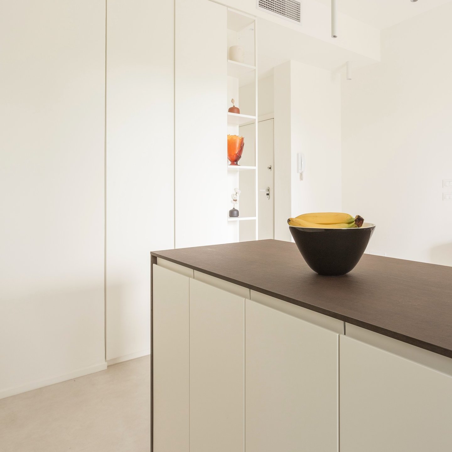 La palette cromatica, volutamente monocolore, si ispira alle tonalità della sabbia: una scelta che amplifica la luminosità naturale e restituisce agli ambienti un’atmosfera rilassata. La luce, filtrando attraverso le grandi vetrate, diventa la vera protagonista, disegnando volumi e superfici in un equilibrio sobrio e accogliente.