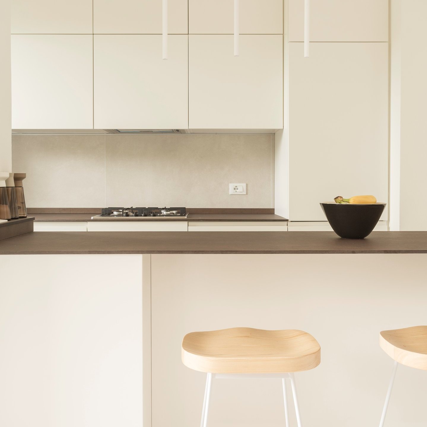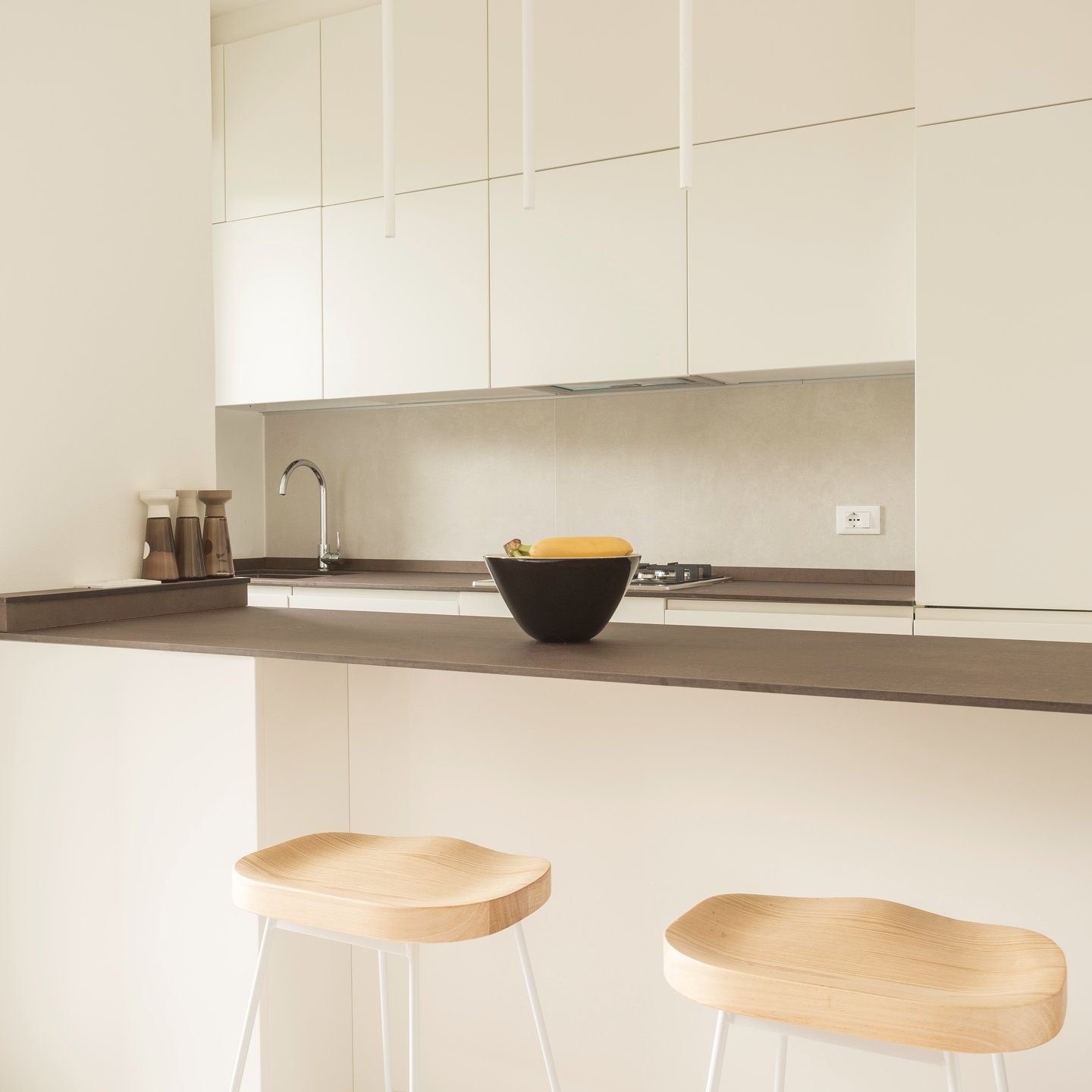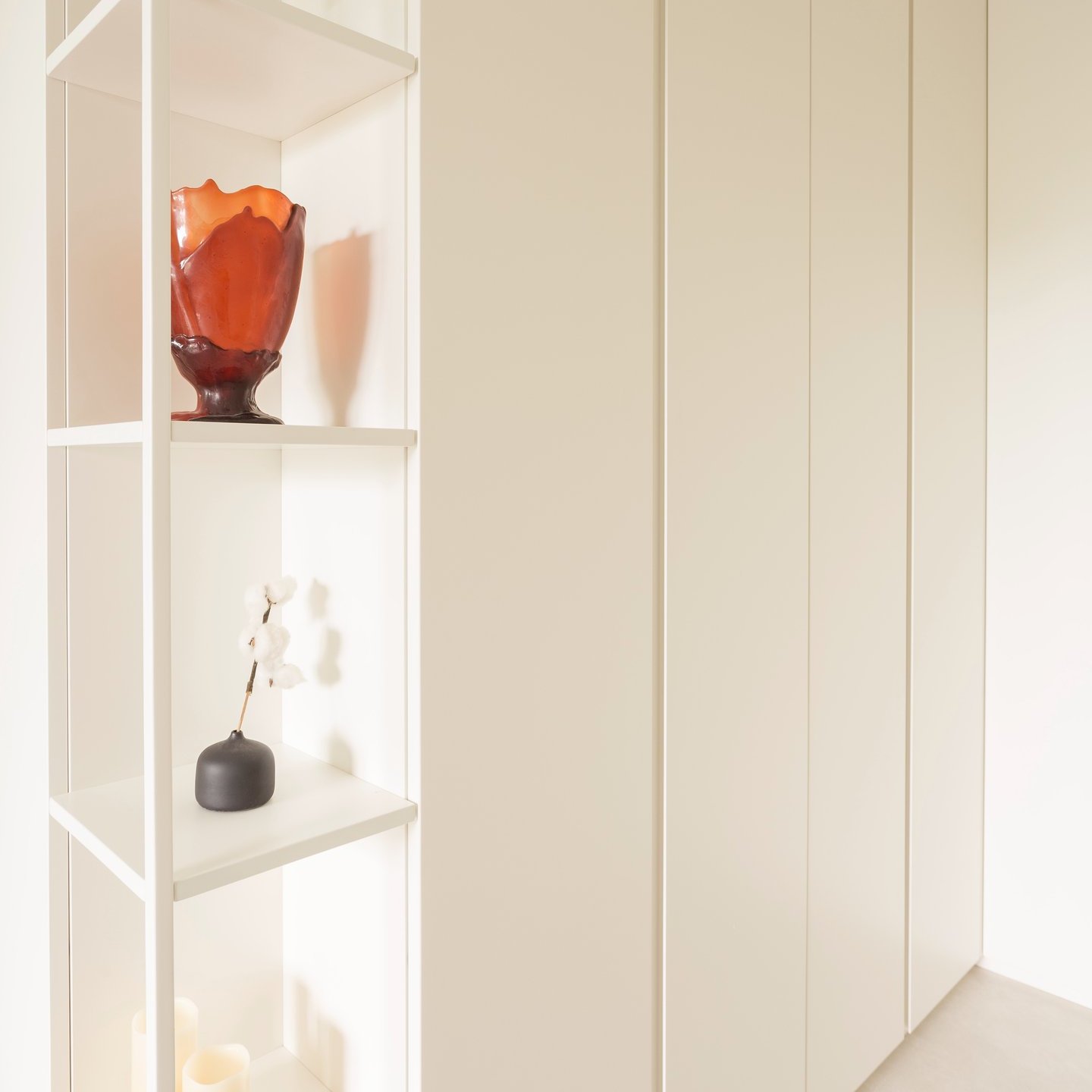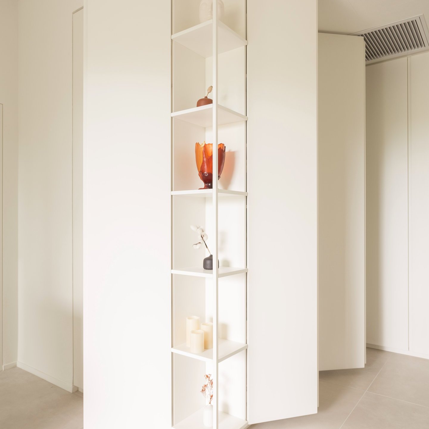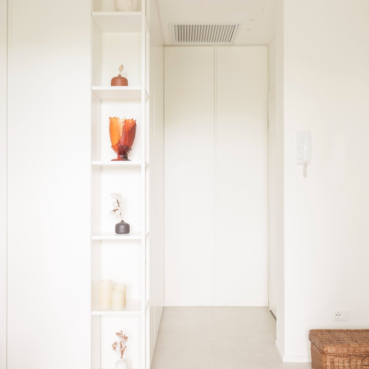 La palette cromatica, volutamente monocolore, si ispira alle tonalità della sabbia: una scelta che amplifica la luminosità naturale e restituisce agli ambienti un’atmosfera rilassata. La luce, filtrando attraverso le grandi vetrate, diventa la vera protagonista, disegnando volumi e superfici in un equilibrio sobrio e accogliente.